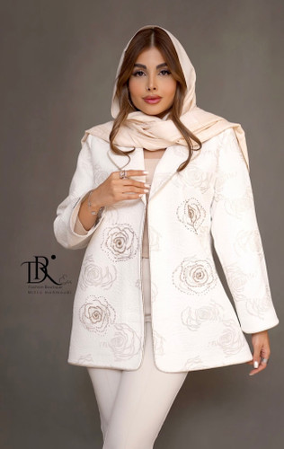 کت ژاکاردسفید نباتی گل رز جواهر دوزی